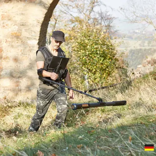 When using the detector in horizontal orientation, the probe is attached to the Telescopic Rod and the tablet is mounted above the handle. In this way, the detectorist is able to control the detector via software on the tablet very easily. Moreover, the horizontal orientation of the probe allows to record more values at once thanks to the integrated Multi-Sensor technology.